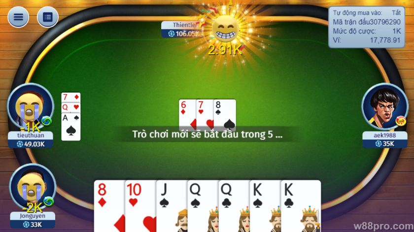 - Đa dạng bàn chơi, mức cược linh hoạt: Trò chơi Tiến lên miền Nam Gemwin cung cấp nhiều bàn chơi với mức cược khác nhau, phù hợp với mọi đối tượng người chơi, từ người mới bắt đầu đến các cao thủ sành sỏi. Người chơi có thể thoải mái lựa chọn bàn chơi phù hợp với khả năng tài chính và trình độ của mình.